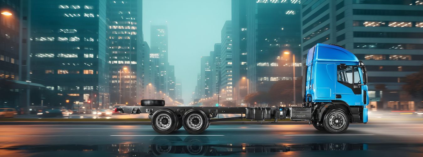 O chassi é do tipo escada, com longarinas em perfil “C” em aço de alta resistência, projetado para suportar operações severas e grandes volumes de carga.