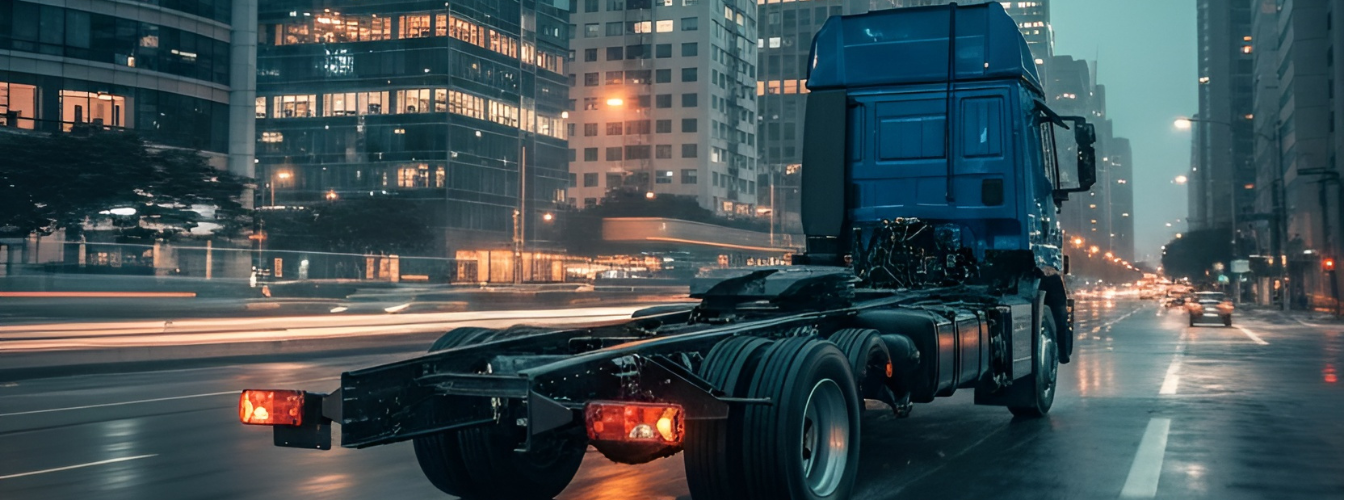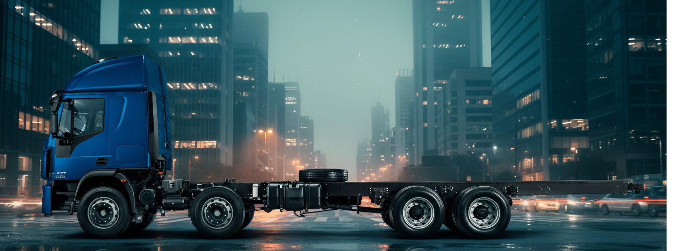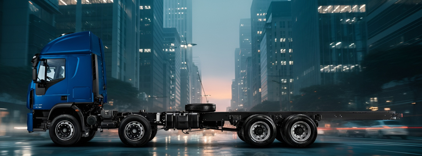 Conta com chassi tipo escada, com longarinas reforçadas em perfil “C” em aço de alta resistência, preparado para implementações robustas.
